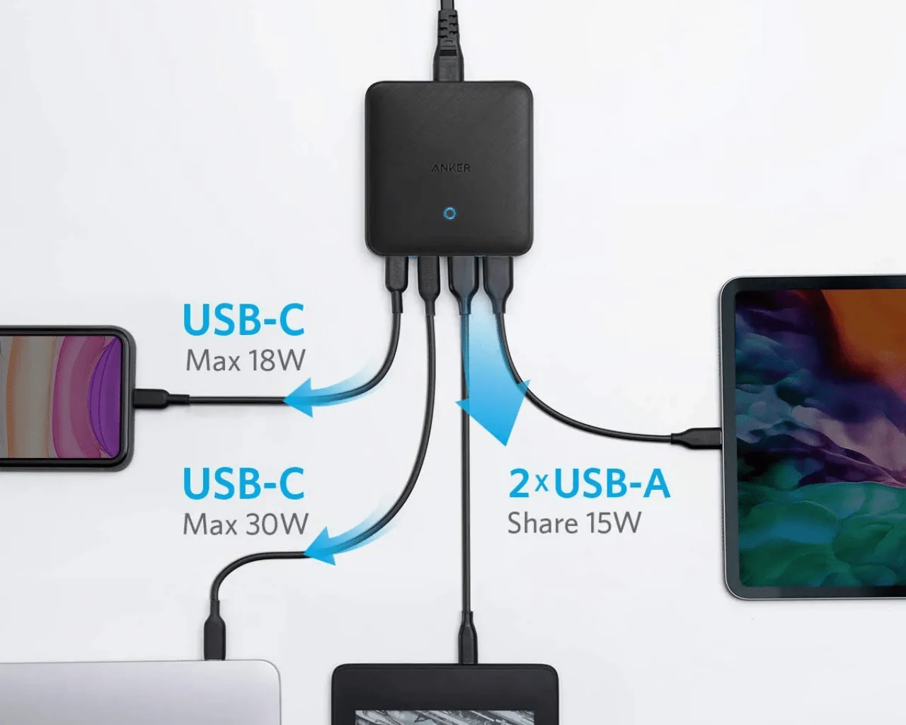 Use the 45W USB-C port to charge an iPad Pro 12.9ā in 2 hours, or charge USB-C laptops including Dell XPS 13 and MacBook Air 2018 at full speed.