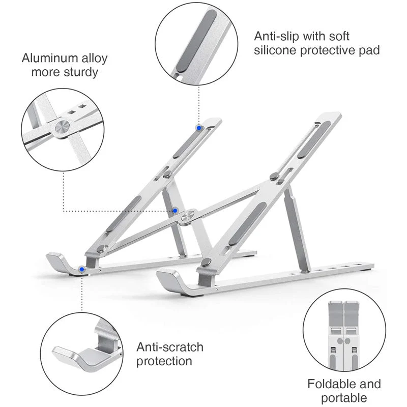 This portable laptop stand is made of aluminum alloy with well-polished surfaces and soft rubber pads, protecting your devices from scratches or sliding. Portable Aluminum Foldable Laptop Stand Adjustable Height Folding Laptop Holder Solid Stand With Anti Slip Rubber Grips. Using metal aluminum, the laptop stand is light and textured.