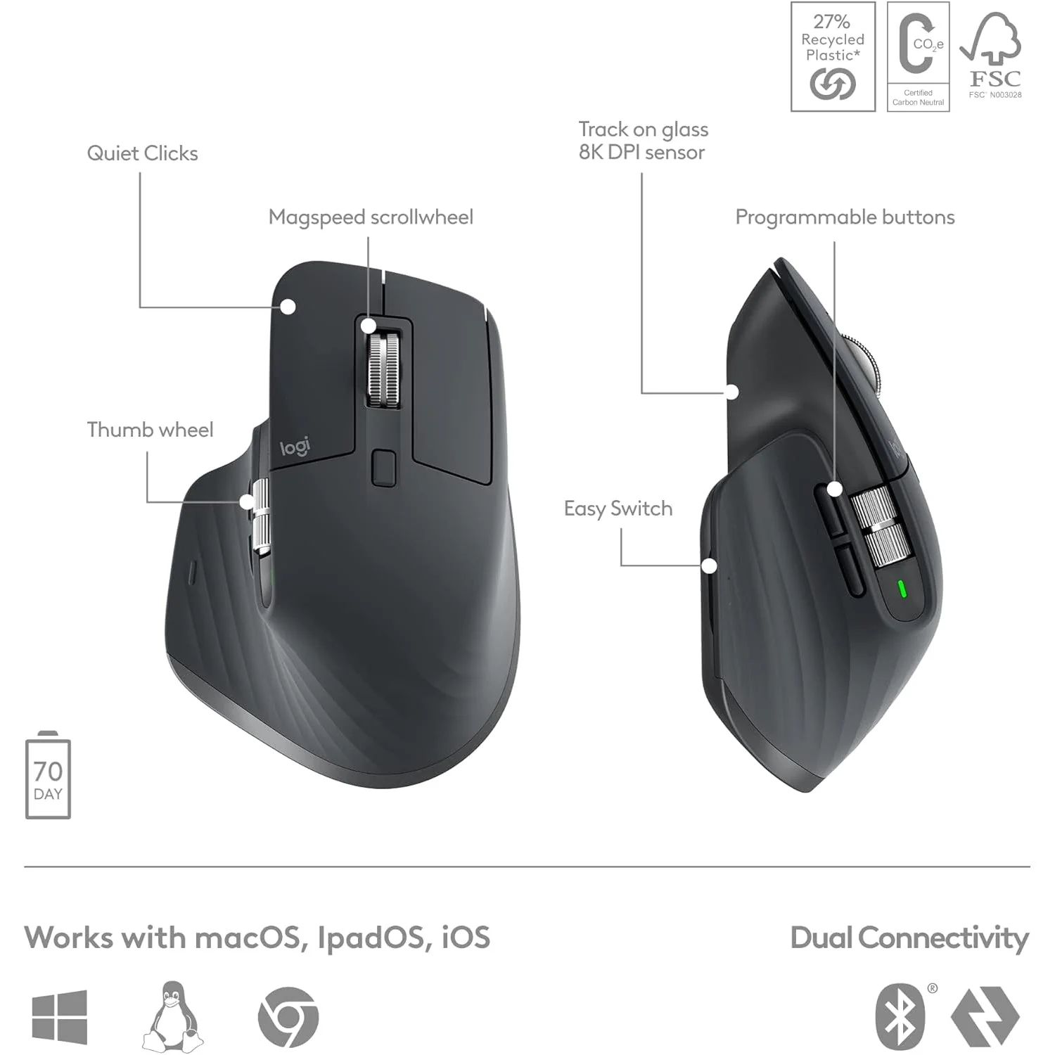 | Both MX Keys S and MX Master 3S include certified post consumer recycled plastic — MX Master 3S (27% for Graphite, 22% for Pale Grey); MX Keys S (26% for Graphite and 11% for Pale Grey) |