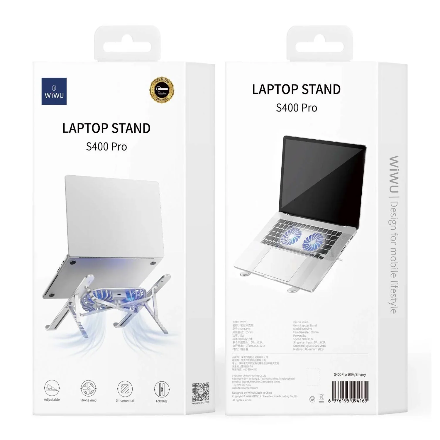 WIWU S400 Pro MacBook Cooling Fan Stand has 2 cooling fans, forward tilt angle and open rear design for maximum airflow to help MacBook/Laptop operate without overheating.